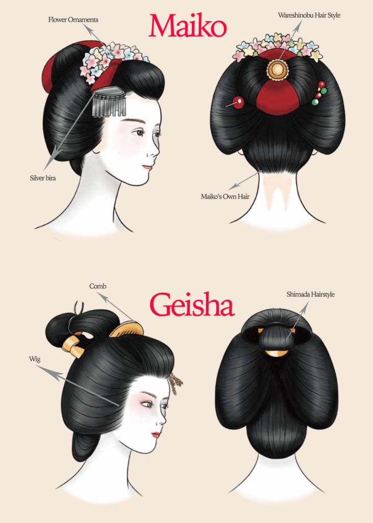 Maiko là những cô gái trẻ đang trong quá trình học nghề. Họ thường mặc kimono rực rỡ hơn, tóc được trang trí cầu kỳ, và học các kỹ năng như: